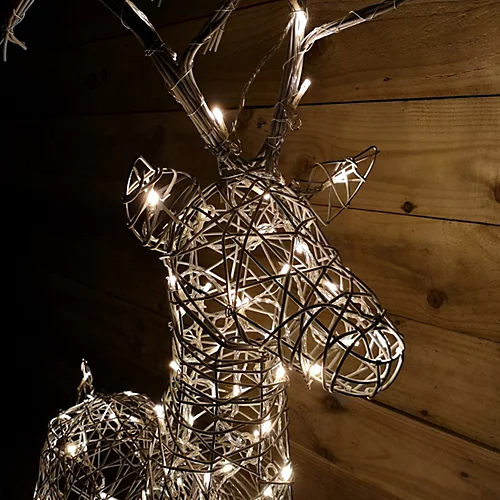- Reindeer made from a grey faux wicker wrapped around a metal frame.