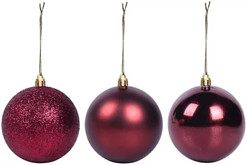 - This pack contains 3 burgundy baubles an assortment of glitter, matte and shiny surface finish. Each bauble measures approximately 15cm and comes with a silver top with a silver string loop attached.