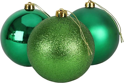 - This pack contains 3 dark green baubles an assortment of glitter, matte and shiny surface finish. Each bauble measures approximately 15cm and comes with a silver top with a silver string loop attached.