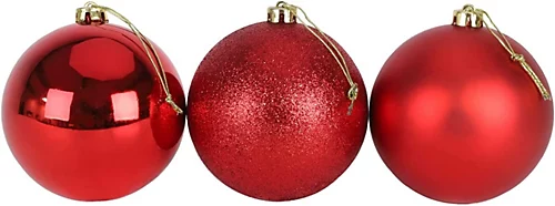 - This pack contains 3 red baubles an assortment of glitter, matte and shiny surface finish. Each bauble measures approximately 15cm and comes with a golden top with a golden string loop attached.