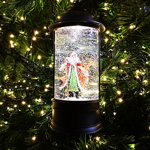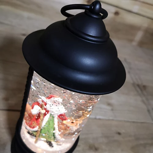 Snowtime 29cm Christmas Glitter Water spinner in a black antique style lantern