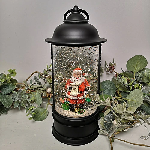 - Set in a 29cm black antique style lantern, the scene inside depicts a lovely festive scene of Santa surrounded by presents