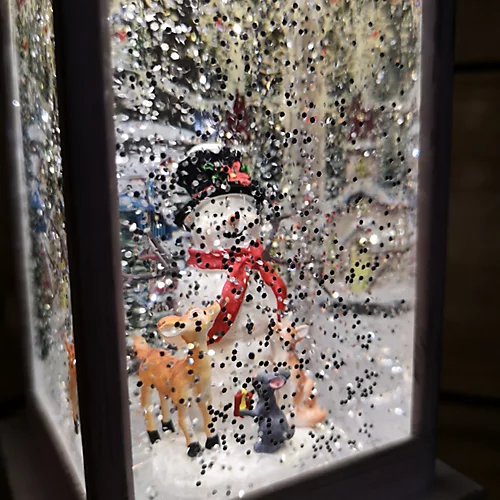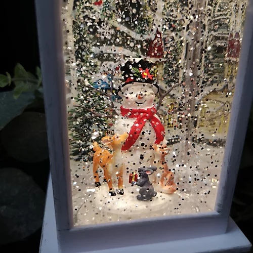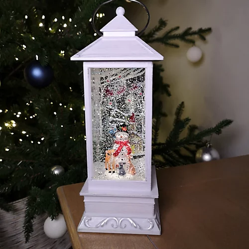 - Set in a 31cm white antique style lantern, the scene inside depicts a lovely festive scene of a Snowman with woodland animals