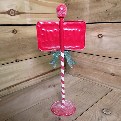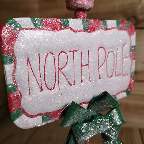 - Decorative metal sign on pole stating “North Pole”, the home of Santa