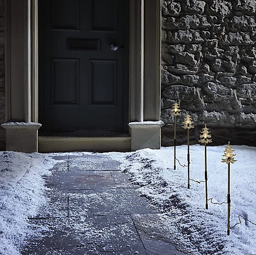 - Set of 4 Christmas Tree Stake Lights: Give a warm welcome at Christmas time with these path stake lights. Four acrylic Christmas trees, 45cm tall and linked 80cm apart by cable, can be arranged to light the way to your door.