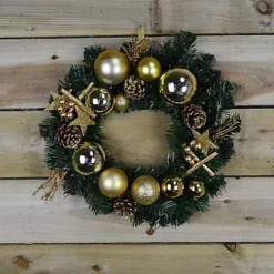 40cm Christmas Door Wreath with Gold Baubles; Glittered, Glossed & Matt with Pine Cones & Stars.