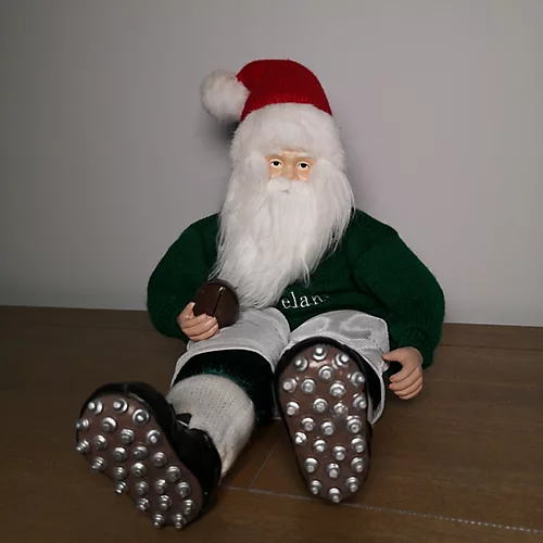 Rooting for Ireland, Santa is wearing a green knitted top with sport shorts and boots
