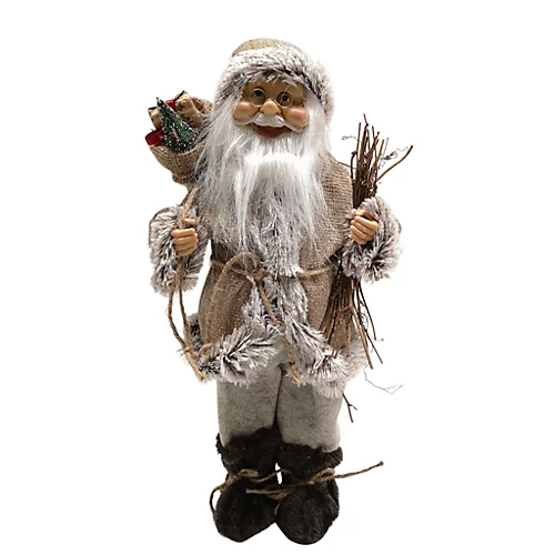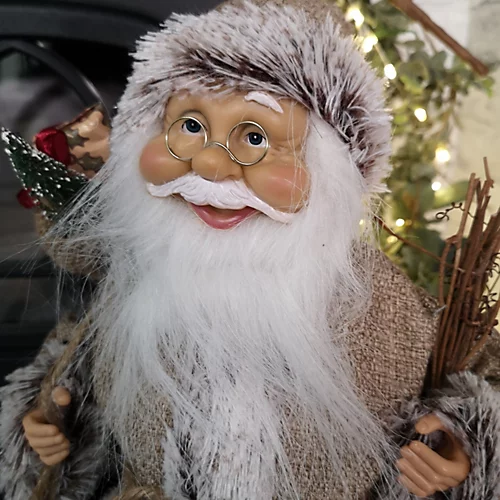 Add the magical touch to your home this year with this standing Santa decoration. Santa is wearing a light Brown suit jacket with dark Brown and Grey fur trim, Grey pants and dark Brown boots. He is carrying a sack over one shoulder with Christmas gifts inside and carrying a bundle of sticks. Santa’s hat features a jingle bell and he is also wearing round Gold spectacles. Santa is free standing and can be placed freely anywhere in your home ideally on flat surfaces, Suitable for indoor use only. Measuring at 45cm tall this Santa decoration makes the perfect choice for any Christmas display or a centrepiece at the dining table. Dimensions H: 45cm W: 20cm