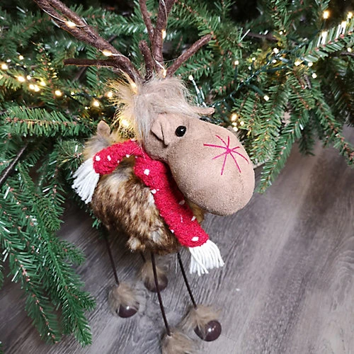 - This furry reindeer is wearing a stylish festivered and white knitted scarf