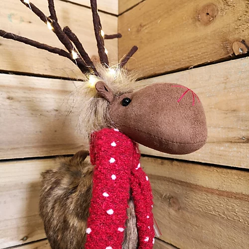 - This delightful reindeer has LED lights in his antlers which will create a warm hue when lit
