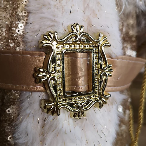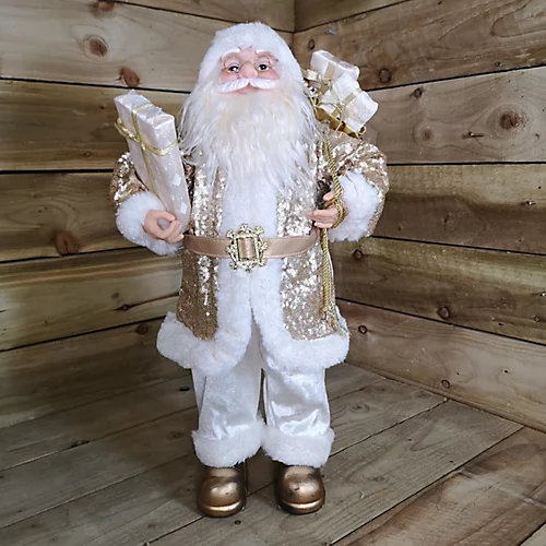 - Dressed in a glittering gold & white suit with fur trim and carrying those all important gifts