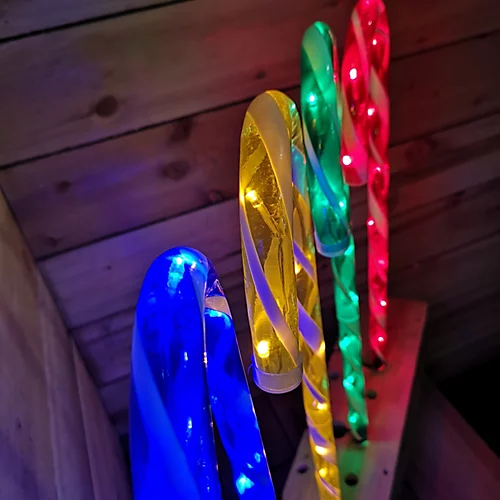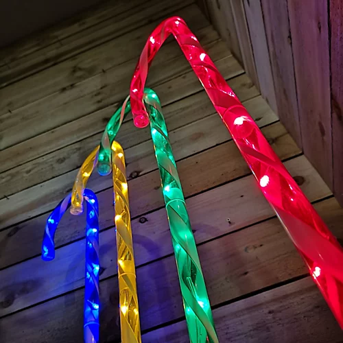 Light up your garden with these sweet red, green, blue and yellow Christmas Candy canes