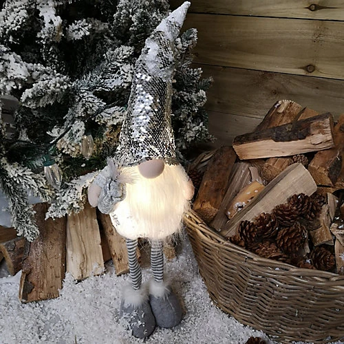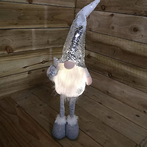 This festive christmas gonk is white in colour, with a silver sequin festive hat. standing at 66cm tall. Made from a plush material, meaning it is soft and friendly for all the family. Featuring a light up body, with warm white coloured LED’s. Requires 3 x AAA Batteries (Not included)