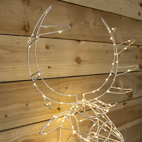 A robust white metal frame is wrapped in silver pin wire containing 120 warm white micro LEDs