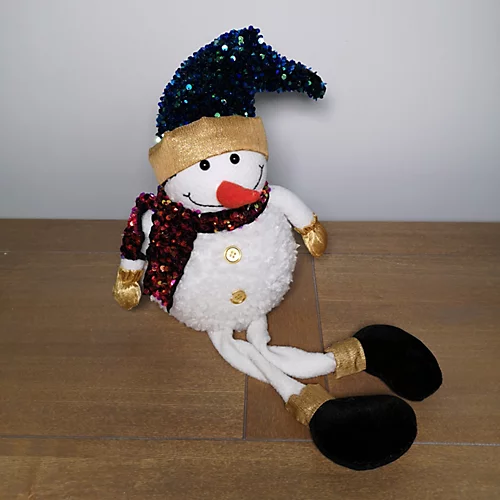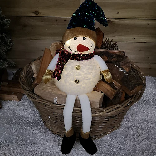 Adorable festive Christmas Sitting Snowman with dangly legs which is illuminated by LED light
