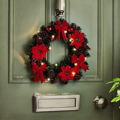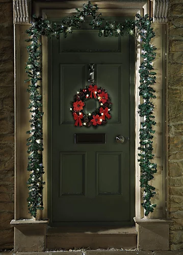 Give your Christmas guests a warm welcome with this magnificent wreath. A riot of festive red, it’s made up of large fabric poinsettia blooms interspersed with matt and shiny red baubles and big satin bows. Set with 15 warm white LEDs, it’s perfect for hanging on the front door, giving out a glorious glow as darkness falls.