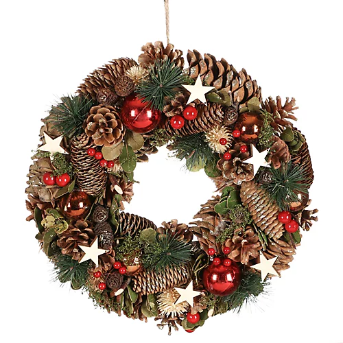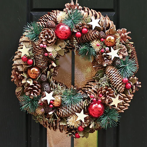 This opulent festive baubles and stars winter wreath features red and bronze coloured baubles set amongst pine cones, artificial berries, fir sprigs and cream coloured stars for a rich, timeless traditional Christmas look.