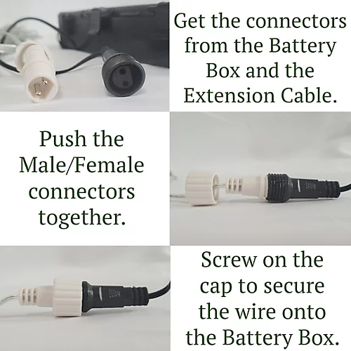 - Connect together using a Male/Female connector. Screw cap ensures a waterproof seal.