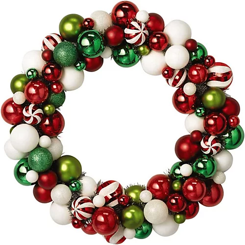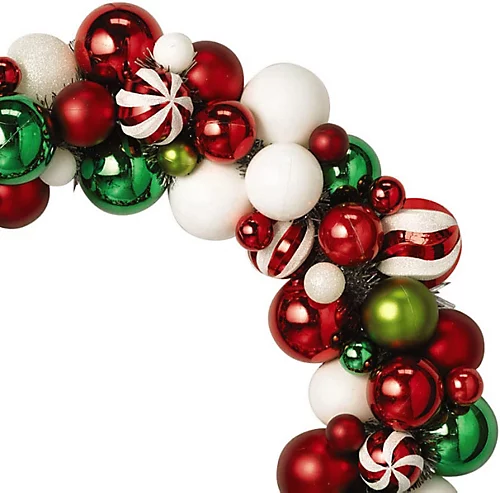 This is a Christmas wreath with a difference, made from nearly 100 coloured baubles. Have the most welcoming front door with the bright and bold red, white and green design. Or make the wreath part of the centrepiece of the festive table.