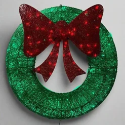 Our 90 cm extra large green festive wreath with red bow is pre-lit with 150 outdoor rated LED’s