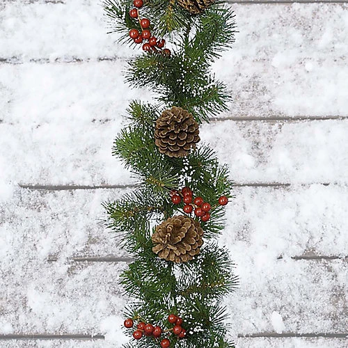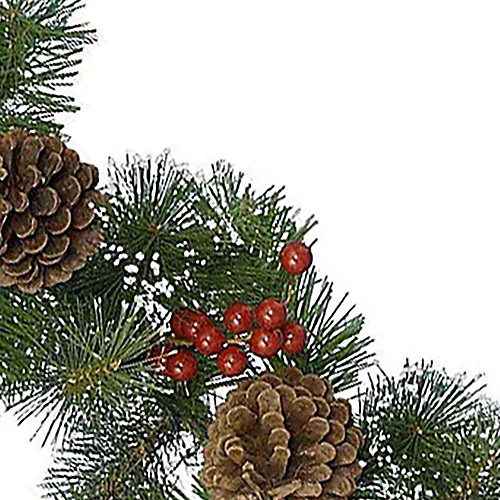 Pinecones and red berries decorate this green garland.