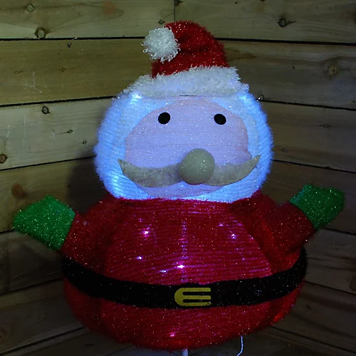 Christmas Collapsible Light up Santa Decoration . 90cm Tall . Collapses for storage . 30 White Led’s provides a subtle light. Timer included 6 hours on 18 hours off . For Indoor and Outdoor Use.