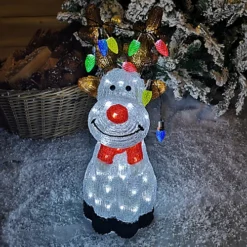 50cm Outdoor Acrylic Sitting Ice White Christmas Reindeer With Multi Coloured LED Lights On Antlers