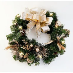 - It’s a wonderful way to greet all your visitors with festive cheer. The wreath is richly decorated with pine cones, lifelike greenery, golden touches and 10 twinkling LED lights