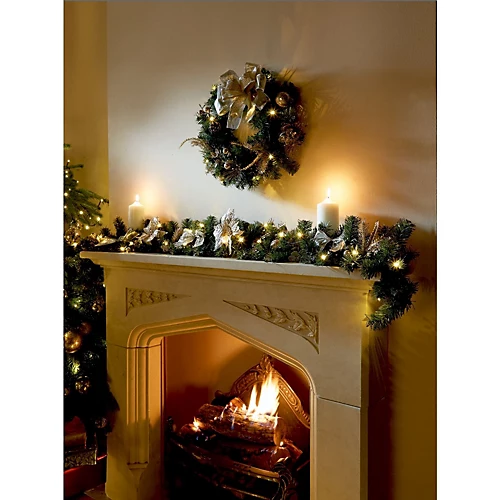 This Christmas wreath will crown your front door or sit proudly above your mantelpiece. It’s a wonderful way to greet all your visitors with festive cheer. The wreath is richly decorated with pine cones, lifelike greenery, golden touches and 10 twinkling LED lights. Finally, a fabulous cream ribbon adds a stylish flourish. Wreath measures 17 x 41cm dia 10 LED lights Requires 2 x AA batteries – not included Matching candle holders, centrepiece and garland also available