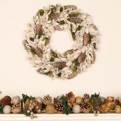 This luxury Christmas wreath is the perfect wreath for woodland lovers who want to bring nature into your home. The sturdy wreath is made up of natural pine cones and wood-chip petals to create a unique design for your front door. Decorated with white berries and green leaves and moss, let this wreath remind you off walks through the woods. Place the wreath on your door with the rustic twine hoop to keep it in place for the entire festive period or enhance your table design for Christmas dinner by using it as a table centrepiece with a lovely candle in the middle.
