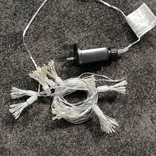 - 10 warm white starburst lights, with 200 LEDs, 30cm spacing between each star, on a clear / silver cable