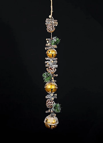 - Hanging Decoration Bell Christmas Home Wall Door Decor Art Craft for Xmas Party. It has brown wooden sticks on top and wrapped with bells, Pinecones, leaves dusted with snow and berries.