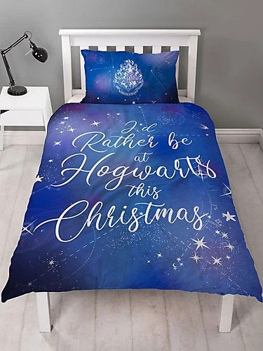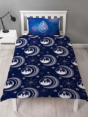 This official Harry Potter Celestial single duvet cover is the ideal festive bedding set for any fans of the universally popular books and films. The design features the words I’d rather be at Hogwarts this Christmas in white on a rich blue star patterned background, while the reverse has a beautiful crescent moon and bauble motif in a repeat pattern on a deep navy blue background. This cotton mix bedding set can be machine washed and tumble dried on a cool setting.