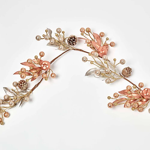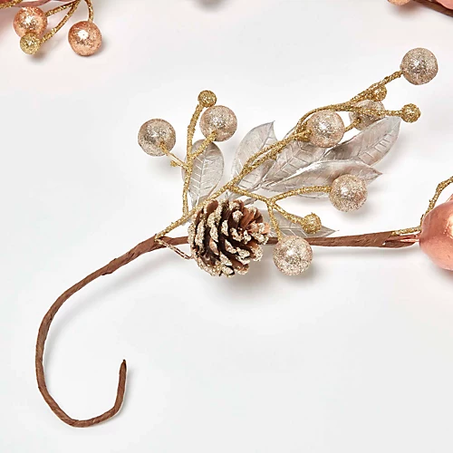 - Gold and champagne Christmas garland with pinecone, berries and apple decoration.