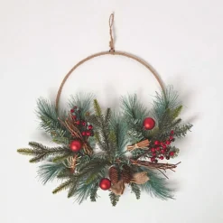 Homescapes Christmas wreath. Bring the festive style to your front door with the traditional winter wreath. Classically styled and made with faux berries and evergreen foliage, this decoration can be a great gift for you or for friends and family. Ready to hang both indoors or outdoors and measuring 50cm wide, each classic wreath includes an easy-hang loop to make mounting it an easy task. When hanging outdoors, we advise doing so in a sheltered area, such as the inside of a porch or under a door canopy. For the complete Christmas experience, shop the Homescapes range of Christmas gonks, garlands, dining table sets and more.