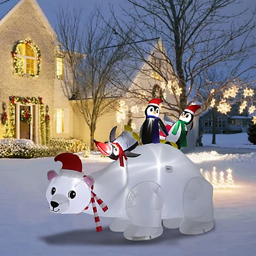 A cartoon polar bear and penguin that everyone will love, LED lights have been installed inside the structure to create a warm and inviting glow as it stands at night. Automatically inflates when plugged in, and deflates quickly too.
