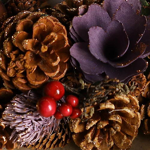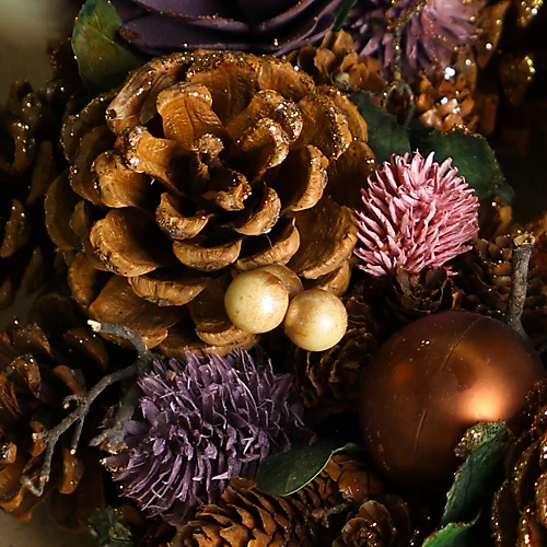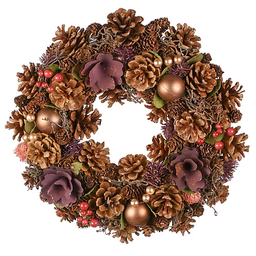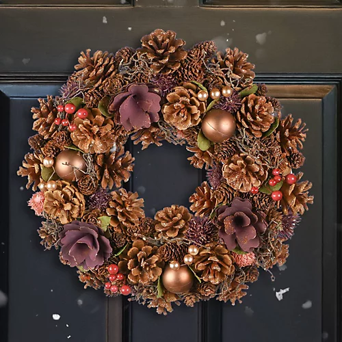Bring a touch of woodland magic to your front door this Christmas with this pinecone and bauble wreath. Decorated by hand with an abundance of mulberry thistles, heather coral, rich real pinecones, deep bronze gold baubles and clusters of red and gold berries, delicately finished with a light dusting of snow.