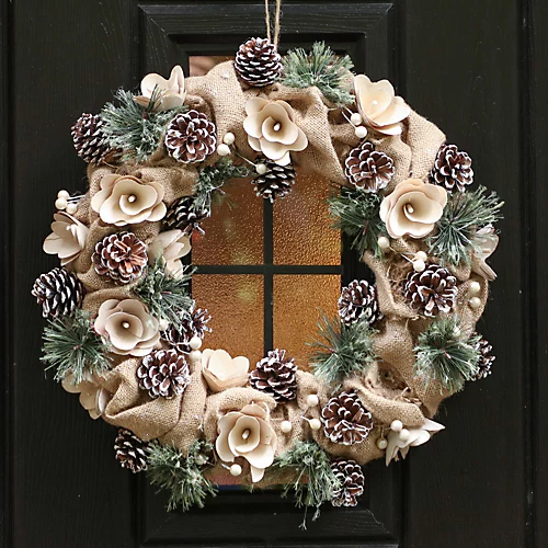 This country style natural jute wreath is perfect for a rustic home this Christmas. Hand crafted with a solid frame wrapped in woven jute fabric decorated with snowy pinecones, glittery wooden flowers, and green sprigs this large wreath makes a wonderful Chrtistmas decoration for any home.