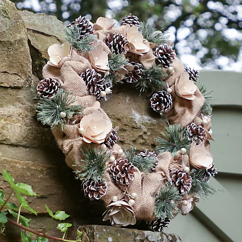 - Made with natural pine cones, woven jute hessian fabric and woodchip roses