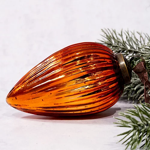A pack of 2 beautiful individually hand blown ribbed glass pinecone shaped baubles, measuring approximately 12cm in length, an ornately detailed bronze cap and co-ordinating coloured organza tie.