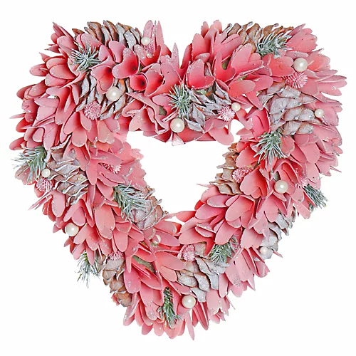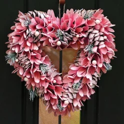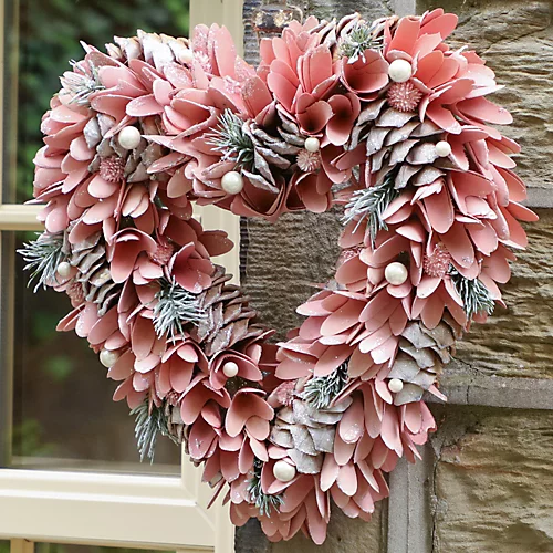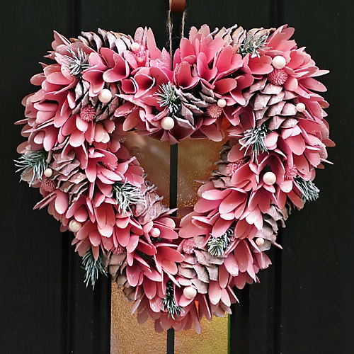 You are sure to fall in love with our beautiful heart shaped pink Christmas wreath this winter. With its delicate pink-coloured wooden crocuses, natural pine cones and pearl bead berries, it’s so pretty you’ll want to keep it up all year around. The perfect country home accessory, our crocus floral wreath boasts a delicate shimmer finish that will introduce an extra touch of festive sparkle into your home. This winter wreath is perfect inside or outdoors, hung from a door, mantelpiece, banister or shelf using the jute hanging string. This hand finished wreath can also be placed around the home as a stunning showpiece.