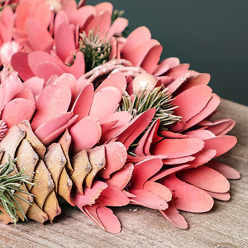 - Beautifully decorated with pink-coloured wooden crocuses, natural pine cones and pearl bead berries