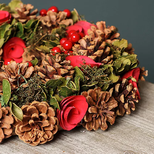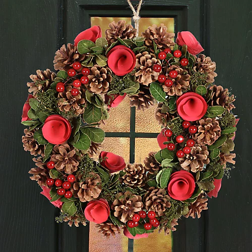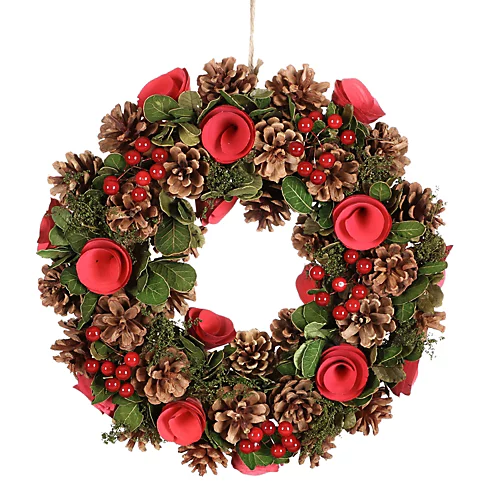 - Beautifully decorated with artificial rose flowers, pine cones and crisp green leaves