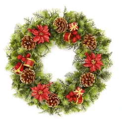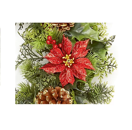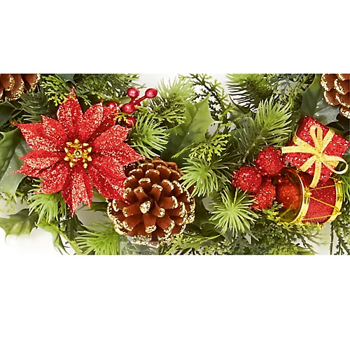 - Decoration finished with artificial Poinsettia flowers pine cones drums and presents