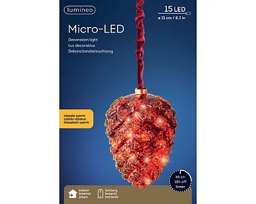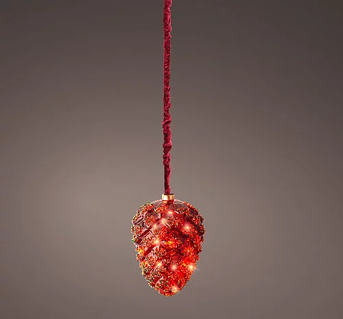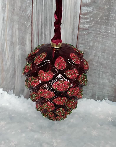 Red pine cone with glitter detail and suspended from a felt covered cord