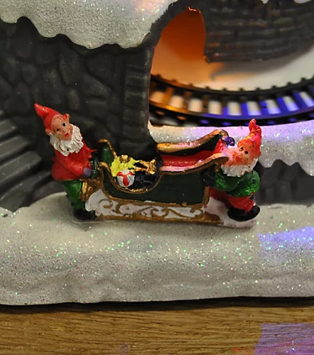 Set in the North pole, Santa stands in front of his workshop with a bag of gifts, while a train of happy children goes through a tunnel under the village. The buildings are lit with LEDs and the train rotates around creating a festive mood that will keep children and adults captivated alike.