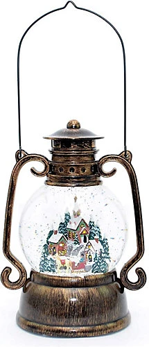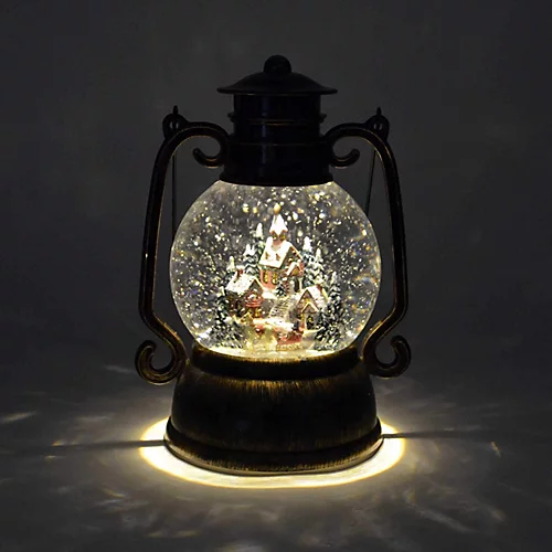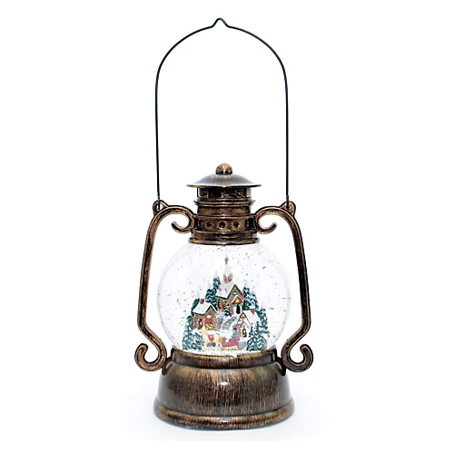 Musical town Christmas LED light-up Lantern. Christmas nativity old style musical Lantern with LED lights and a snow covered town inside. Continuous swirling glitter, gently flip to loosen glitter. To avoid damage, do not shake. Fantastic for Christmas home decor and gifts etc.