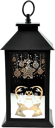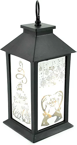 Elegant crafted plastic Black Lantern fitted with Christmas theme designed on glass with warm white LED string light inside. Operated by 3 AAA batteries (not included) with on/off switch ideal for Christmas gifts, Christmas decorations table top decorations approx Size 14cm x 30cm