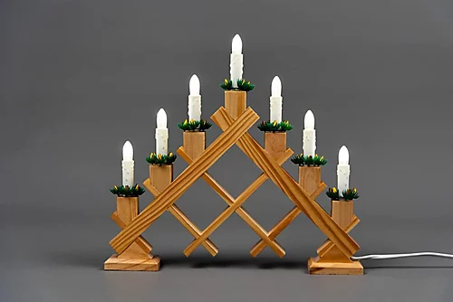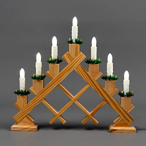 - This is a beautiful example with 7 candles with a small green pine effect with golden miniature pine cones around the base.