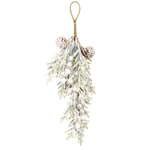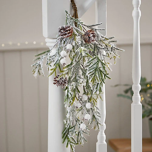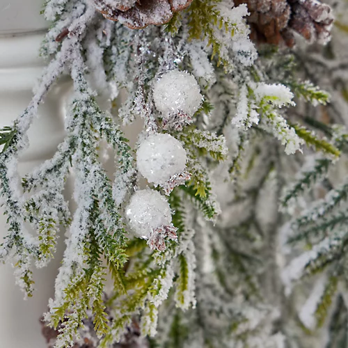 A beautiful alternative to a traditional round wreath. This swag hangs vertically and adorns your door with a festive flurry of White Christmas delights. Handfuls of spruce sprigs are paired with pine cones, cascading snowball berries and greenery. A more relaxed alternative to the usual Christmas wreath, this decorated door swag is handmade and ready to display.